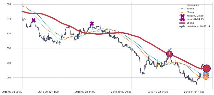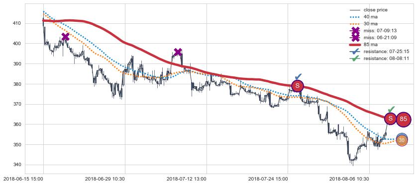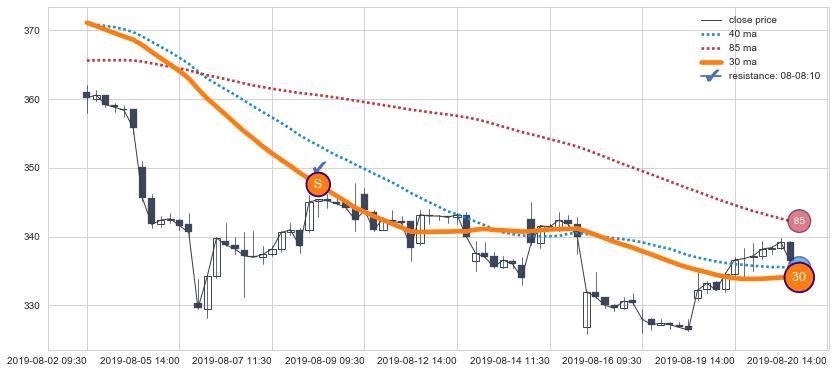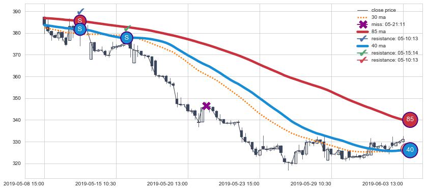 下跌趋势05-08 15:00-06-03 13:00,均线40, 85确认关键阻力2处