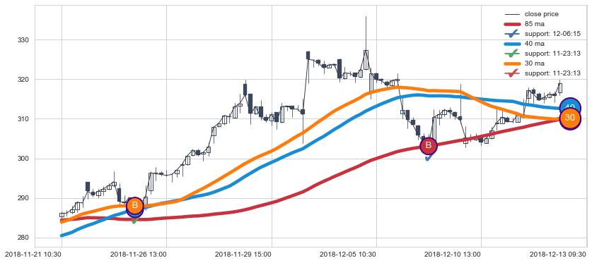 上涨趋势11-21 10:30-12-13 09:30,均线40, 85, 30确认关键支撑2处