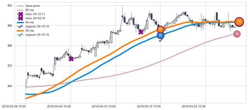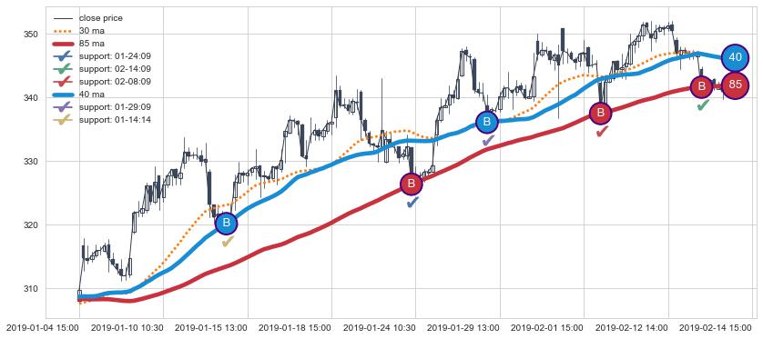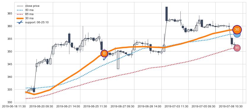上涨趋势01-04 15:00-02-14 15:00,均线40, 85确认关键支撑5处