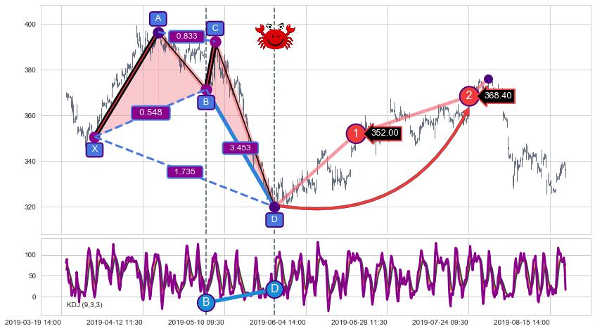 ➢ 谐波价格D点比B点低 ⤵,【KDJ】指标D点比B点高 ⤴️