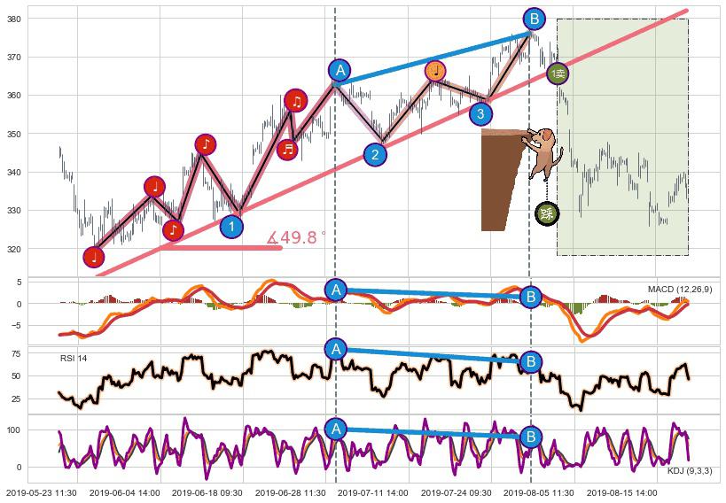 ✂️ 2019-05-27 11:30-2019-08-01 15:00上升趋势存在反转[风险],其原上升趋势的支撑位(381.96)已破位[强阻力信号],原上升趋势角度: 49.8˚