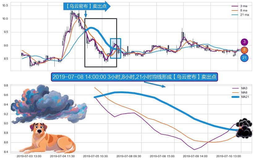 ⚀ 2019-07-04 15:00:00小时-2019-07-10 13:00:00小时显现 3小时-8小时-21小时均线 【乌云密布】卖出点 看空信号,后市看跌,卖出