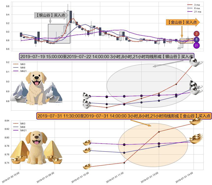 ⚀ 2019-07-31 13:00:00-小时至2019-07-31 14:00:00-小时显现 3小时-8小时-21小时均线 【金山谷】买入点 其再次确认了买入信号,可靠性更强,买入
