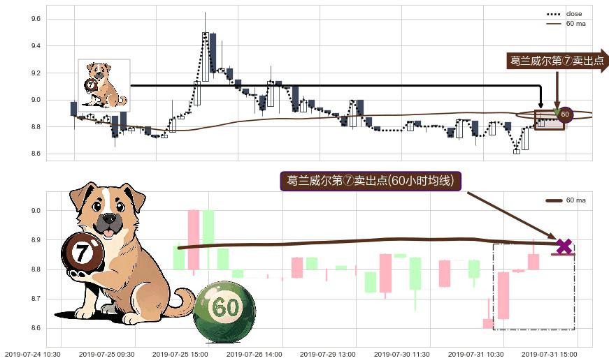⚀ 2019-07-31 15:00:00-小时显现 葛兰威尔均线 60小时均线 第⑦卖出点 下降趋势的中继信号,后市看跌,卖出信号