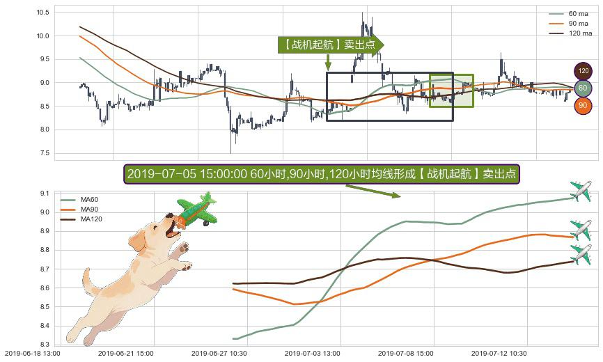 ⚀ 2019-06-26 14:00:00小时-2019-07-15 15:00:00小时显现 60小时-90小时-120小时均线 【战机起航】卖出点 看空信号,后市看跌,卖出