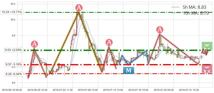 ♘ 支撑价格位8.29,可信任强度59.87%,距离最后交易2019-07-31 15:00形成的收盘价格8.85相差 -6.34%