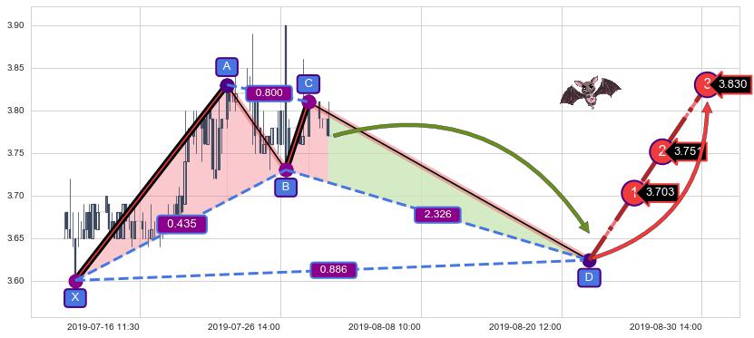 ➣ 未完成【蝙蝠】形态起点X: 07-10:13, 已到达C点: 07-30:11, 预测最终D点: 08-22:10, 共182交易小时