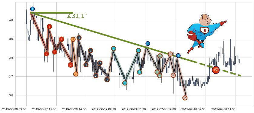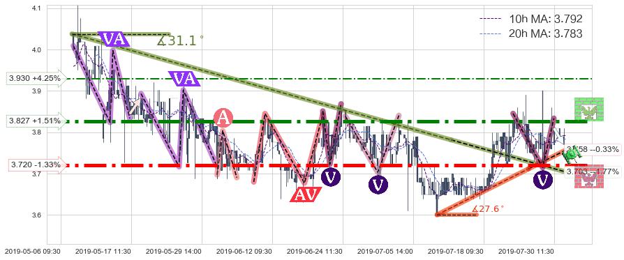 ⚔️ 2019-05-07 11:30-2019-07-12 10:30下跌趋势存在反转上涨[机会],其原下跌趋势的阻力位(3.703)已被突破[强支撑信号],原下跌趋势角度: 31.1˚