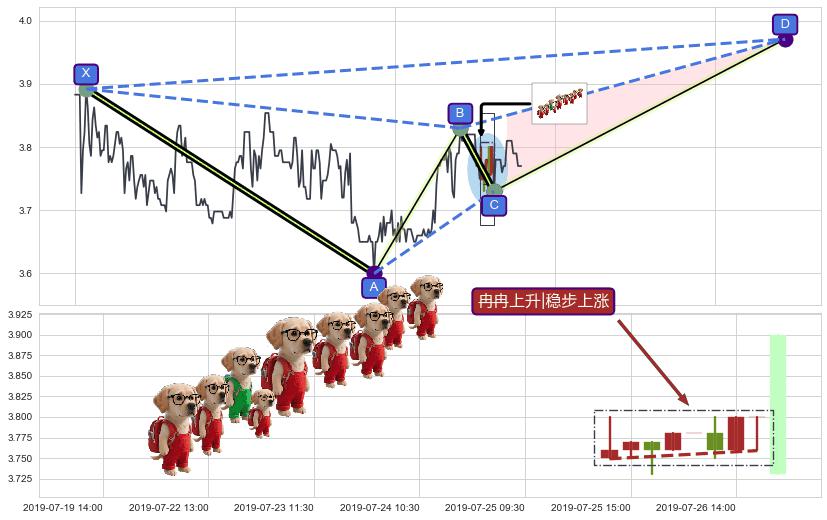 从2019-06-20 09:30至2019-06-24 10:30,共包含14个小时,阶段股价上涨0.83%,阶段股价变动位移路程比: 1 : 10