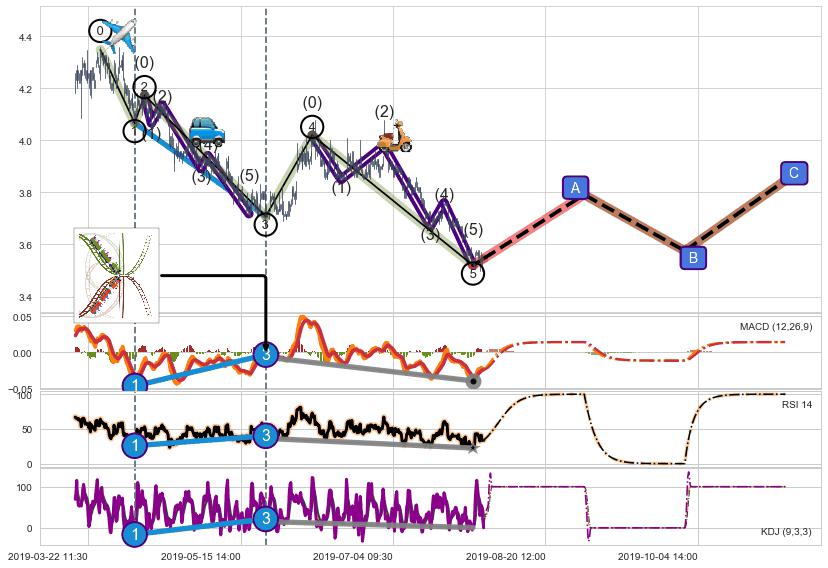 ➣ 1,3,5驱动浪MACD, RSI, KDJ走势都出现【常规背离】反转信号增强