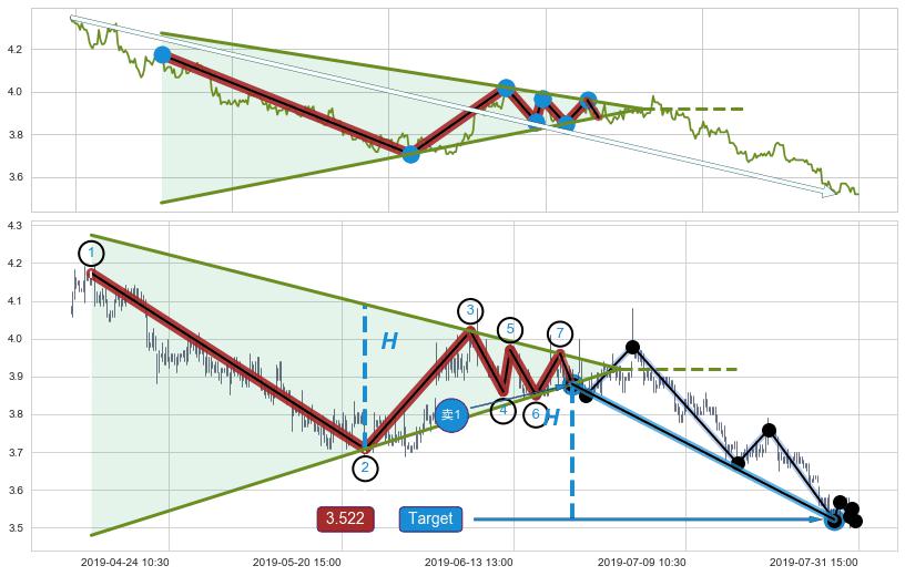 ➣ 最小中继整理跌幅→𝐇: 0.130000 (上平行阻力线与下平行支撑线的垂直距离)