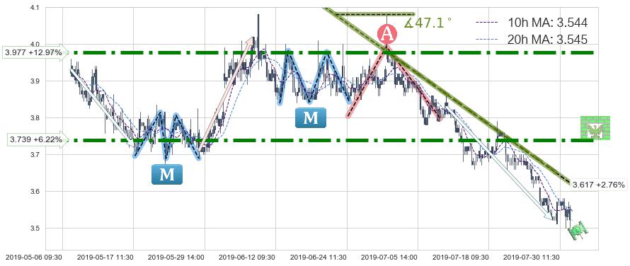 ♘ 阻力价格位3.977,可信任强度88.34%,距离最后交易2019-07-31 15:00形成的收盘价格3.520相差 +12.97%