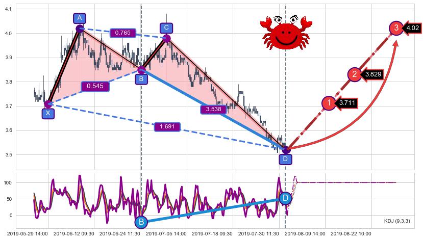 | 4 🅚:上涨两颗星 | 上涨三颗星 ➕ 📡:谐波螃蟹已到达d点:猜想c下行到达d点后报复性拉升上涨(均值回复) ☞ 看多信号 ⇥ 【🅚线】交织【图形】⇥ 综合量化分数: 51 | > |