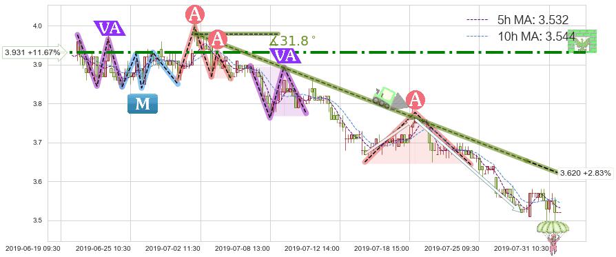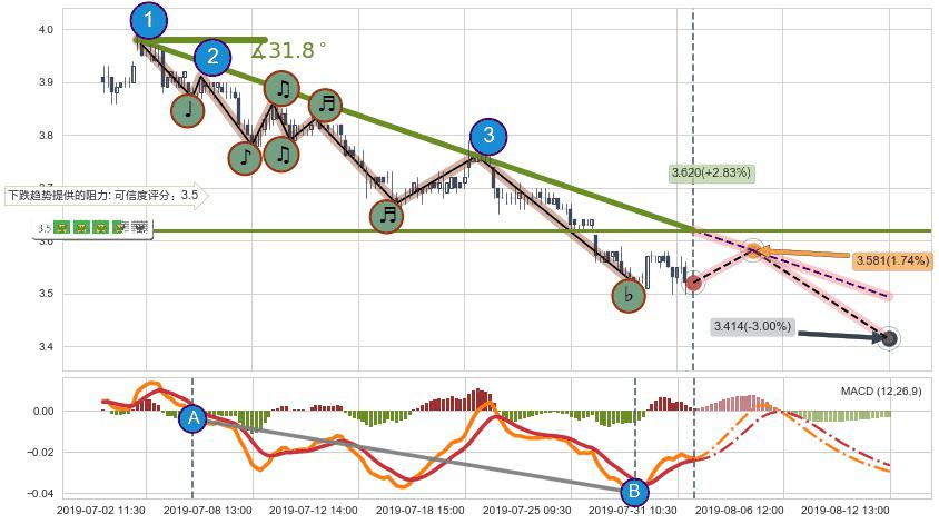 ➢ 预测:2019-08-05 11:00,【小幅反弹】稳定目前下跌趋势的前提下,预测价格:3.581