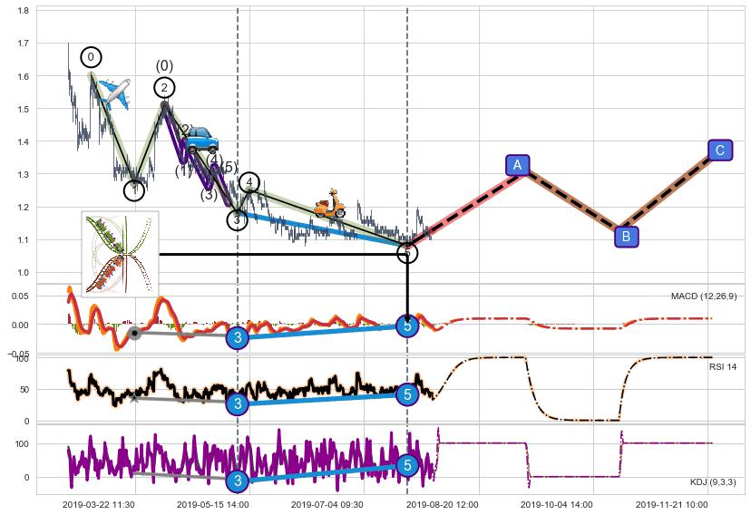 ➣ 1,3,5驱动浪MACD, RSI, KDJ走势都出现【常规背离】反转信号增强
