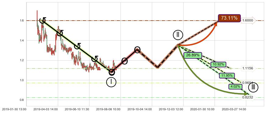 ➣ D点拟合预测价格0.7172,距离最后交易收盘价格1.1100相差 -35.39%