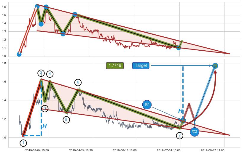 ➢ 最小中继整理涨幅→𝐇: 0.5900 (𝐇楔型旗杆的长度:楔型起点→顶点)