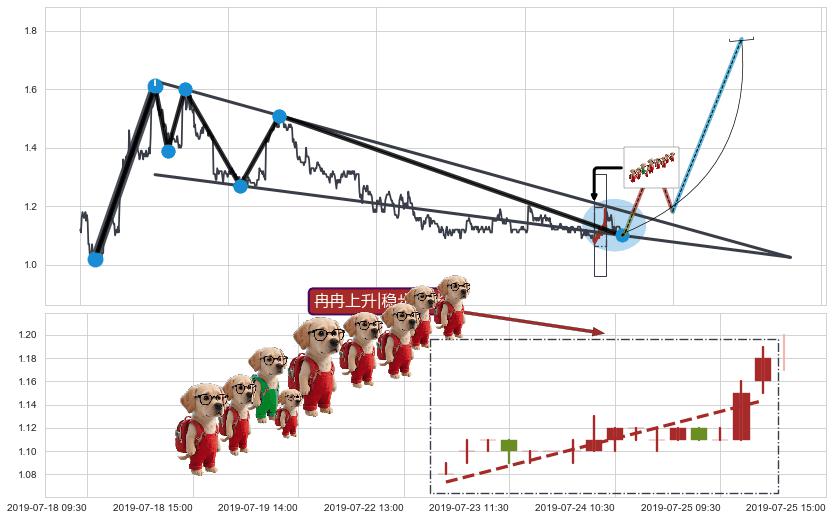 从2019-07-22 14:00至2019-07-31 15:00,共包含44个小时,阶段股价上涨3.01%,阶段股价变动位移路程比: 1 : 10
