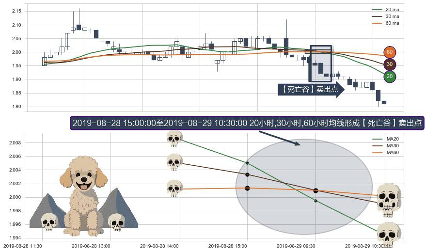 形态多维评估: ⚀ 2019-08-29 09:30:00-小时至2019-08-29 10:30:00-小时显现 20小时-30小时-60小时均线 【死亡谷】卖出点 看空信号,后市看跌,卖出