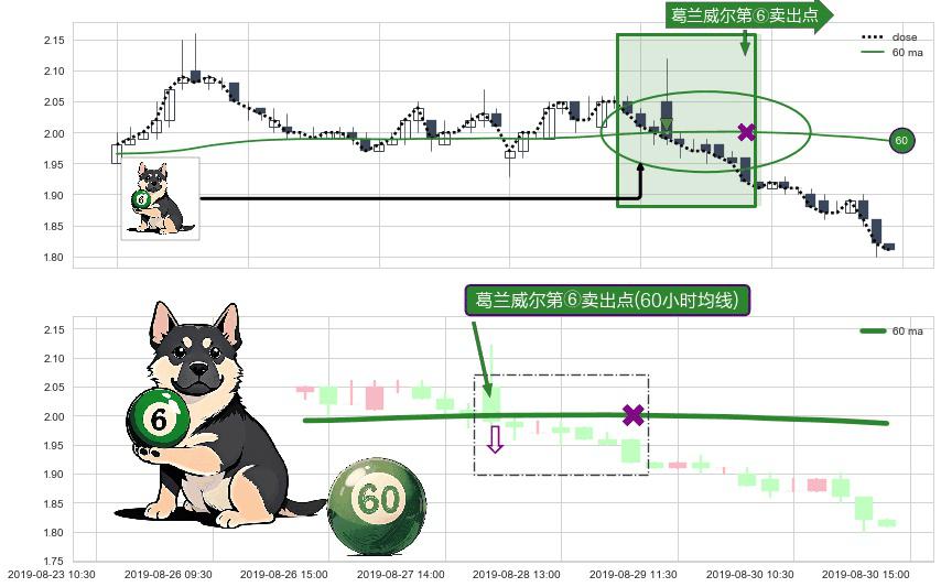 形态多维评估: ⚀ 2019-08-28 09:30:00-小时显现 葛兰威尔均线 60小时均线 第⑥卖出点 走势反转见顶信号,后市看跌,卖出信号