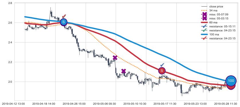 下跌趋势04-12 13:00-05-28 11:30,均线100, 60确认关键阻力2处