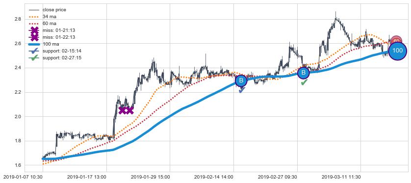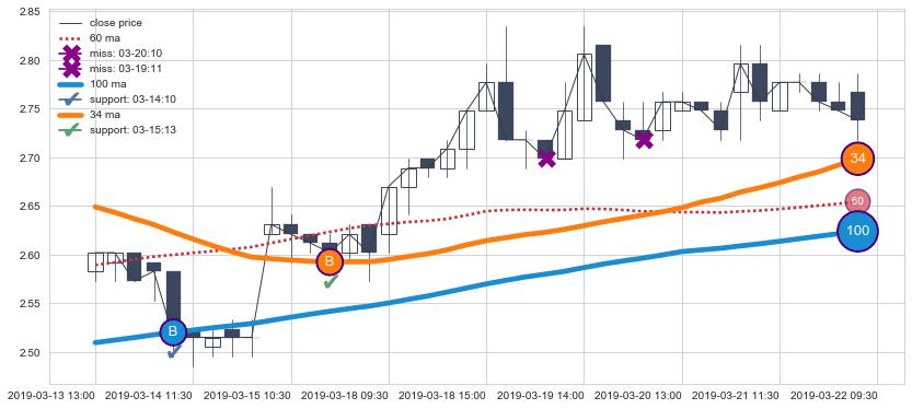 上涨趋势03-13 13:00-03-22 09:30,均线34, 100确认关键支撑2处