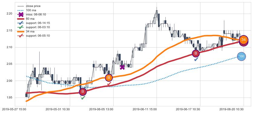 上涨趋势05-27 15:00-06-20 10:30,均线34, 60确认关键支撑3处