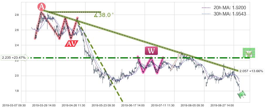 ♘ 在最后的下跌阶段2019-03-19 14:00至2019-08-30 15:00,存在 持续未破位的阻力位 ,阻力价格2.057,可信任强度86.49%,其距离最后价格1.8100相差 +13.66%