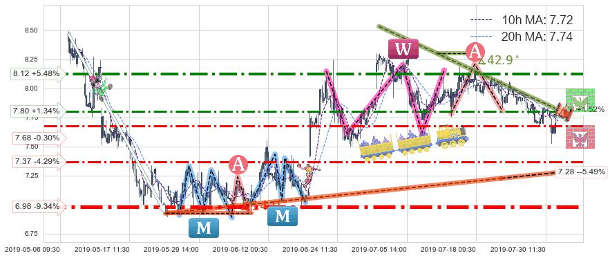 ♘ 阻力价格位7.80,可信任强度55.86%,距离最后交易2019-07-31 15:00形成的收盘价格7.70相差 +1.34%