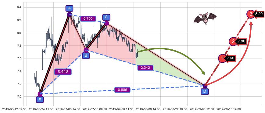 ➢ 距离预测D点位置尚有下跌空间,短线依然【看跌】, 耐心等待看涨【蝙蝠】形态反转启动