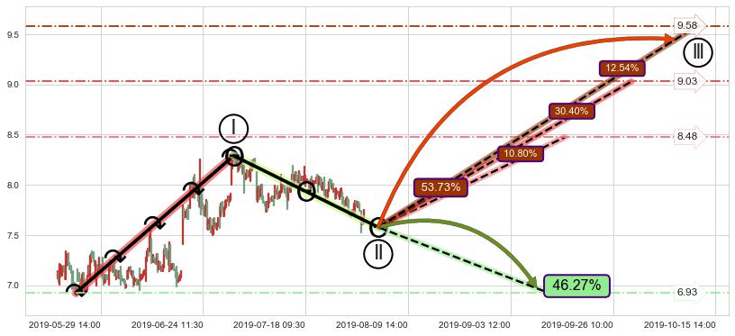 从2019-05-07 09:30至2019-05-23 14:00,共包含71个小时,阶段股价下跌-19.65%,阶段股价变动位移路程比: 1 : 2,2019-05-14 09:30向↘︎形成缺口,跳空下跌-5.29%˚