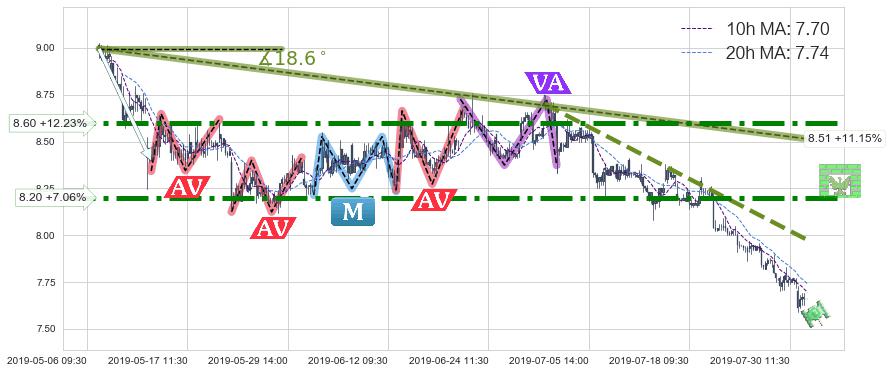 从2019-05-07 09:30至2019-07-31 15:00,共包含354个小时,阶段股价下跌-15.47%,阶段股价变动位移路程比: 1 : 8,下跌趋势角度: 18.6
