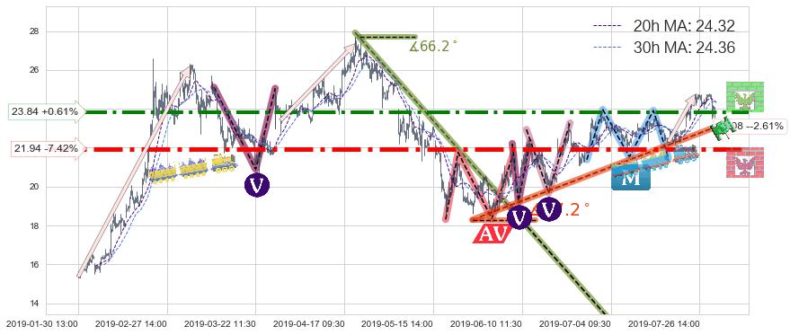 🍖 长线趋势跟踪组合短线均值回复[强支撑信号]2019-05-27 09:30-2019-07-31 14:00上升趋势依然成立(上涨趋势跟踪依然可行),短线价格略微下行回调(均值回复猜想),即将接近趋势提供的未破位的支撑价格:23.08。