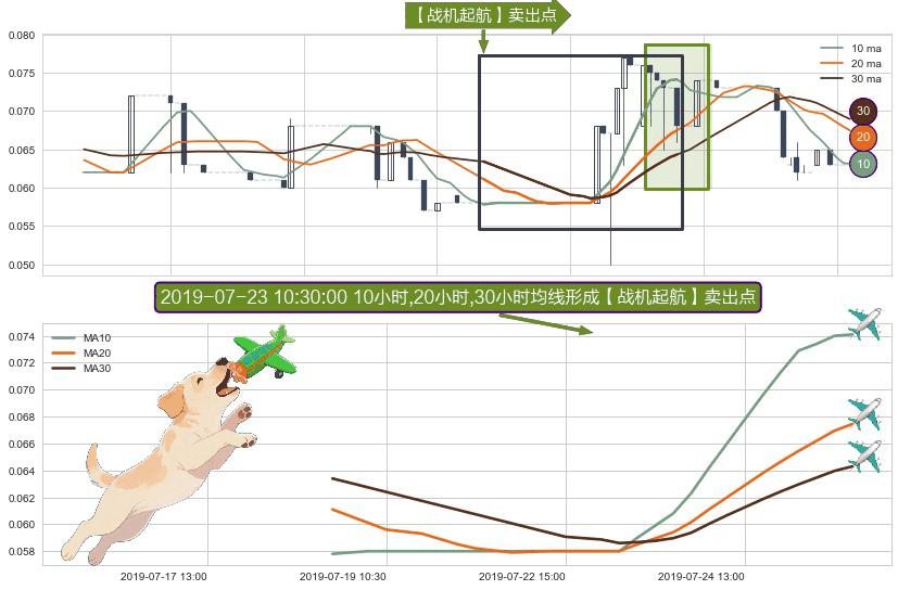 ⚀ 2019-07-18 14:00:00小时-2019-07-25 13:00:00小时显现 10小时-20小时-30小时均线 【战机起航】卖出点 看空信号,后市看跌,卖出