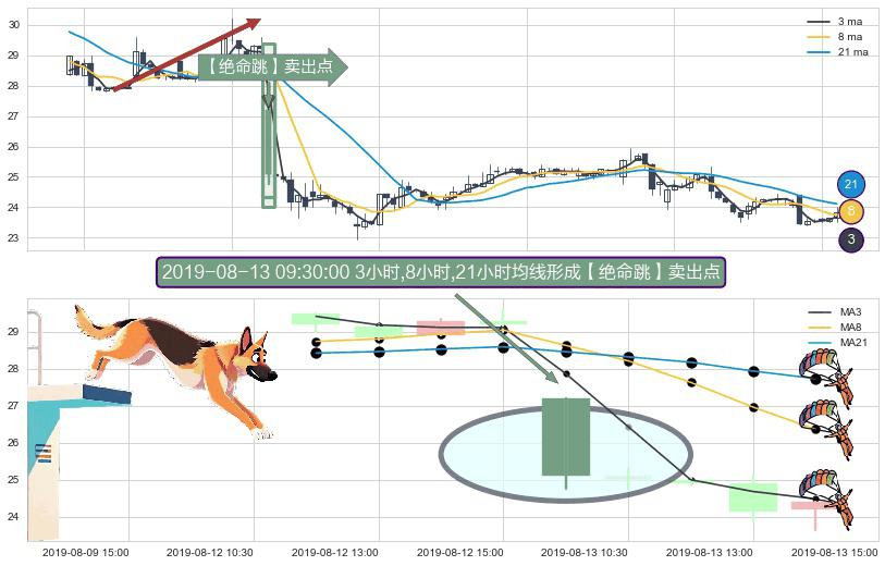 形态多维评估: ⚀ 2019-08-13 09:30:00小时显现 3小时-8小时-21小时均线 【绝命跳】卖出点 看空信号,后市看跌,卖出