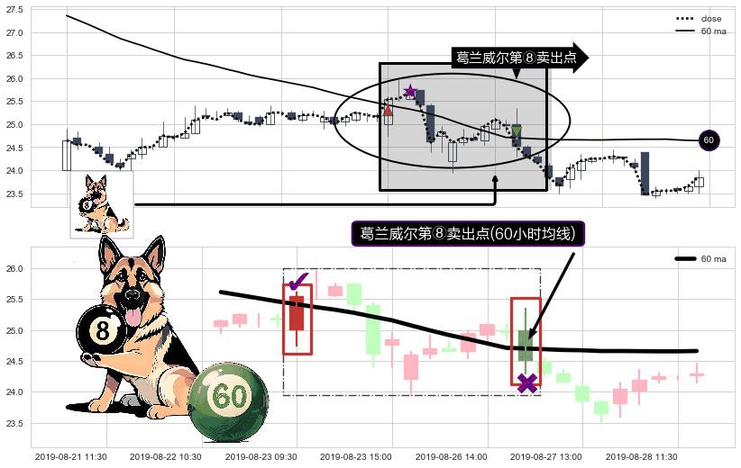 形态多维评估: ⚀ 2019-08-27 09:30:00-小时显现 葛兰威尔均线 60小时均线 第⑧卖出点 下降趋势的中继信号,后市看跌,卖出信号
