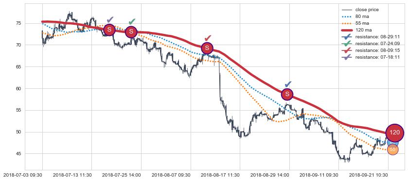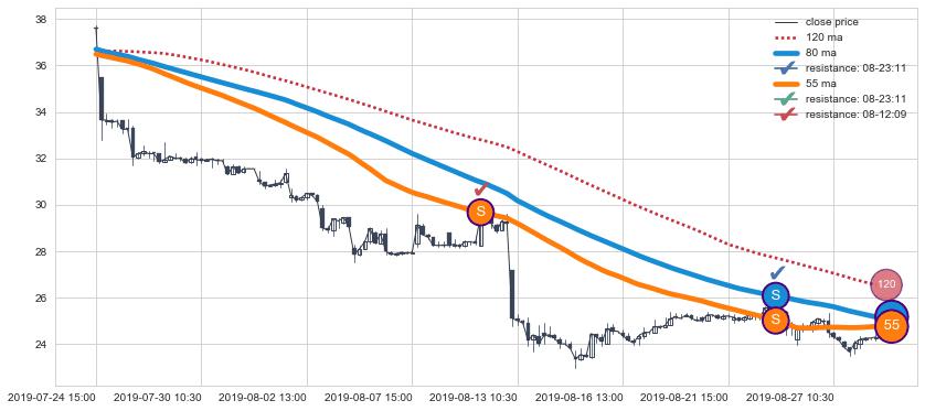 下跌趋势07-24 15:00-08-28 13:00,均线80, 55确认关键阻力2处