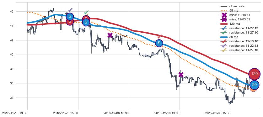下跌趋势11-13 13:00-01-09 09:30,均线120, 80确认关键阻力3处