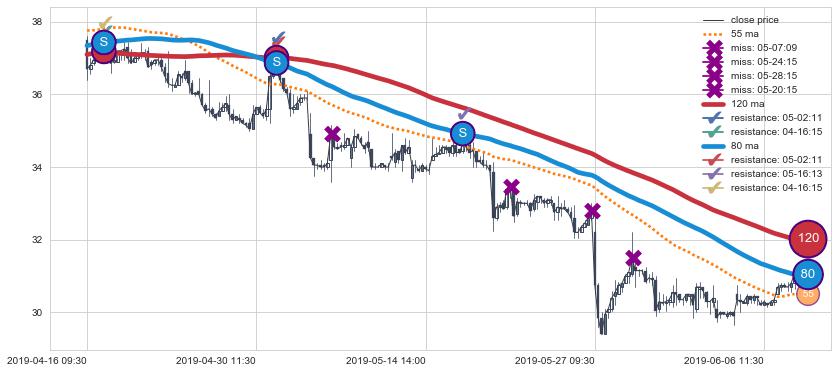 下跌趋势04-16 09:30-06-10 15:00,均线120, 80确认关键阻力3处