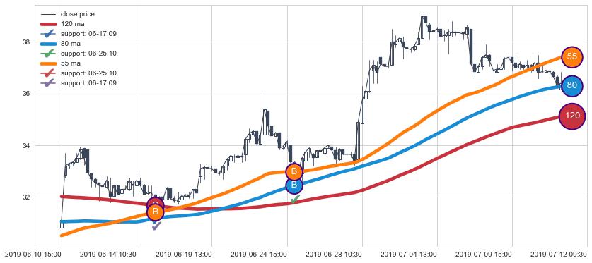 上涨趋势06-10 15:00-07-12 09:30,均线120, 80, 55确认关键支撑2处