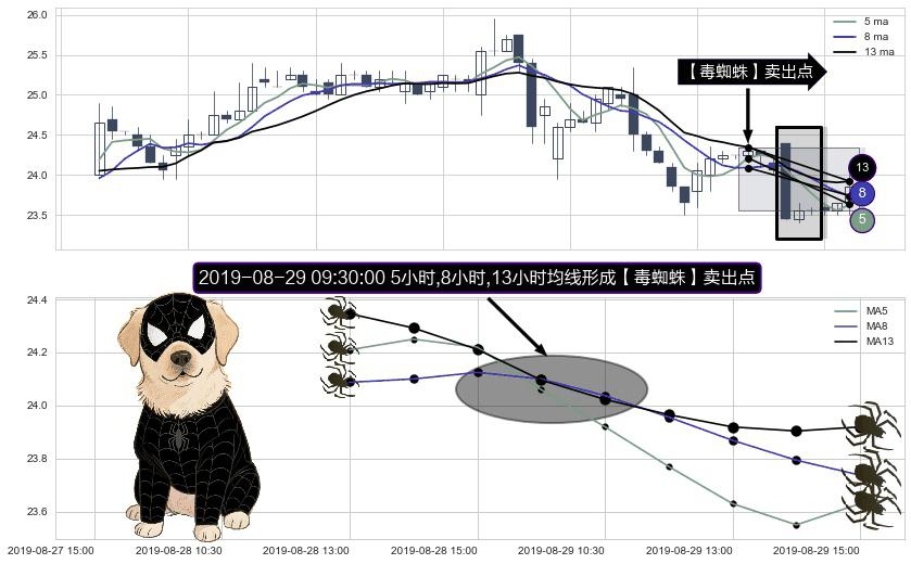 形态多维评估: ⚀ 2019-08-29 09:30:00小时显现 5小时-8小时-13小时均线 【毒蜘蛛】卖出点 看空信号,后市看跌,卖出