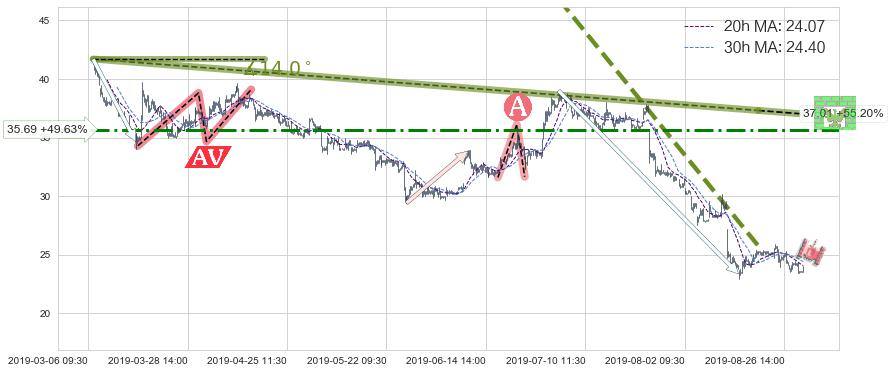从2019-07-03 15:00至2019-08-20 11:30,共包含202个小时,阶段股价下跌-41.12%,阶段股价变动位移路程比: 1 : 4,下跌趋势角度: 58.1