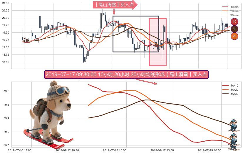 ⚀ 2019-07-12 13:00:00小时-2019-07-19 13:00:00小时显现 10小时-20小时-30小时均线 【高山滑雪】买入点 看多信号,后市看涨,买入