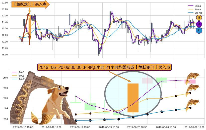 ⚀ 2019-06-20 09:30:00小时显现 3小时-8小时-21小时均线 【鱼跃龙门】买入点 看多信号,后市看涨,买入