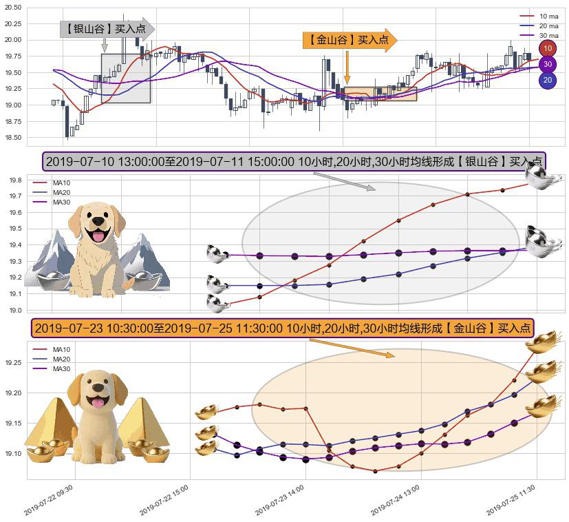 ⚀ 2019-07-23 11:30:00-小时至2019-07-25 11:30:00-小时显现 10小时-20小时-30小时均线 【金山谷】买入点 其再次确认了买入信号,可靠性更强,买入