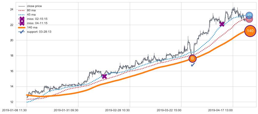 ⚅ 买点向上突破均线后,价格走势很纠结,不断在均线周围试探,有再次下探破位均线的可能