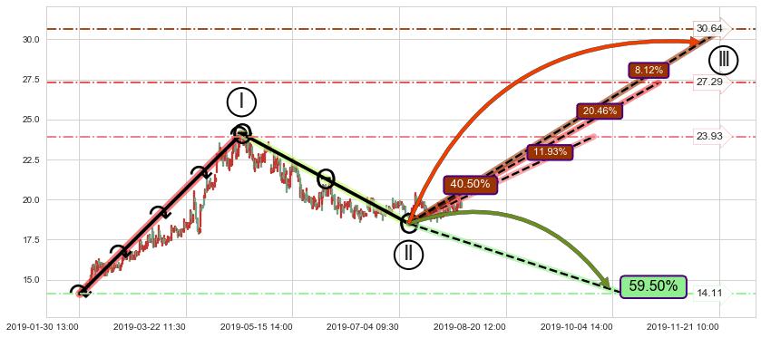 ➣ 调整浪已超过预测的c点位置,但后续大趋势循环浪高概率反转下跌,继续上涨概率40.50%,谨慎做多