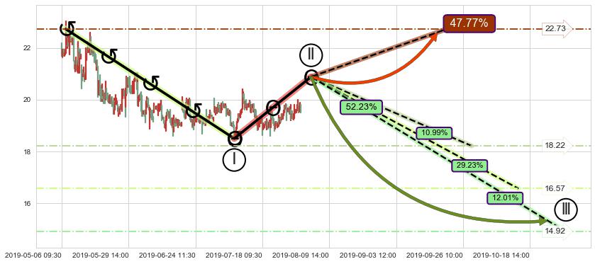 从2019-06-05 10:30至2019-06-21 15:00,共包含71个小时,阶段股价下跌-4.94%,阶段股价变动位移路程比: 1 : 9