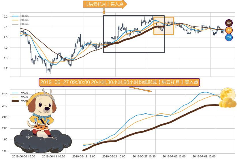 形态多维评估: ⚀ 2019-06-17 10:30:00小时-2019-07-09 15:00:00小时显现 20小时-30小时-60小时均线 【烘云托月】买入点 看多信号,后市看涨,买入