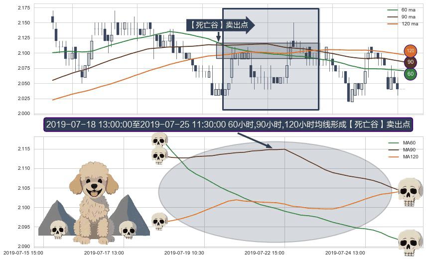 形态多维评估: ⚀ 2019-07-18 14:00:00-小时至2019-07-25 11:30:00-小时显现 60小时-90小时-120小时均线 【死亡谷】卖出点 看空信号,后市看跌,卖出